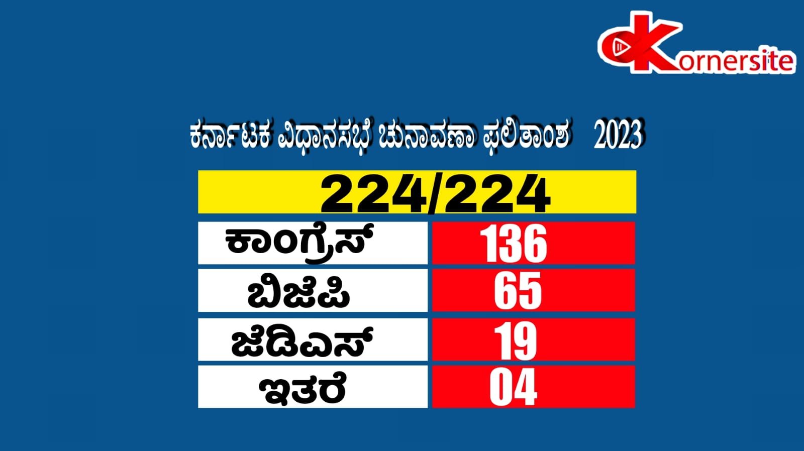 ವಿಧಾನಸಭೆ ಚುನಾವಣೆಯಲ್ಲಿ (Assembly Election 2023) ಕಾಂಗ್ರೆಸ ದೊಡ್ಡ ಪಕ್ಷವಾಗಿ ಹೊರ ಹೊಮ್ಮಿದ್ದು, 136 ಕ್ಷೇತ್ರಗಳಲ್ಲಿ ಜಯ ಸಾಧಿಸಿದೆ. ಉಳಿದಂತೆ, ಬಿಜೆಪಿ 65, ಜೆಡಿಎಸ್ 19 ಹಾಗೂ...